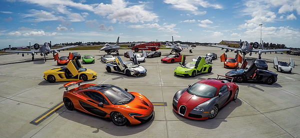 A collection of very expensive exotic cars parked in front of F-16s and A-10s.